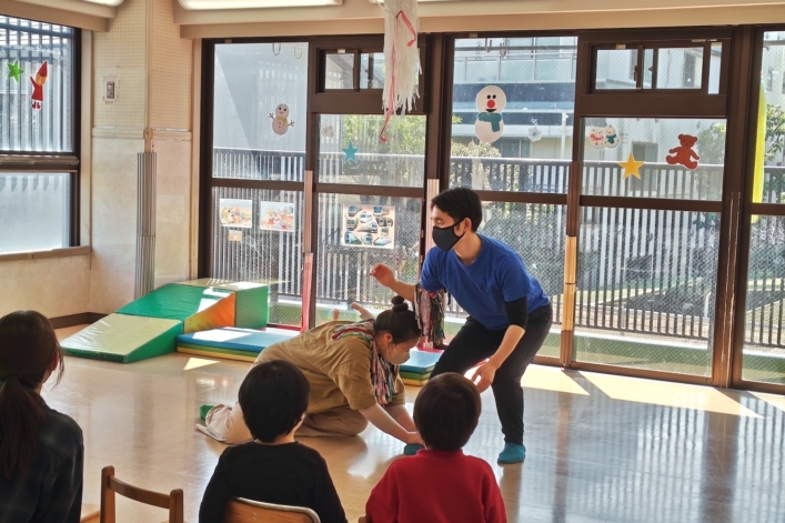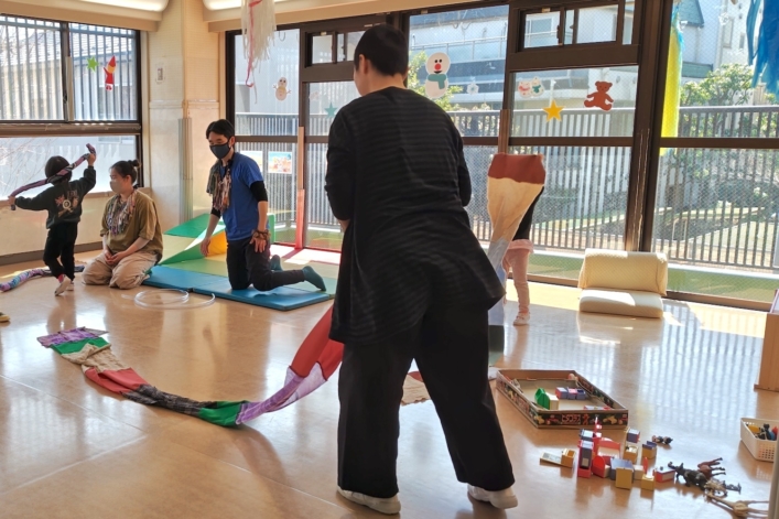 続いて入った教室では、即興パフォーマンスを見てもらいます。不思議な動きを座ってしっかり見ている子もいれば、腕に下げた布の飾りに飛びついて追いかける子も。一通りパフォーマンスが終わると、また一緒に遊びます。長い布の上を花道のように歩いたり、けんけんぱをしたり、縄跳びのように使ってみたり。楽器が大好きなようでずっと嬉しそうに音を出している子もいました。