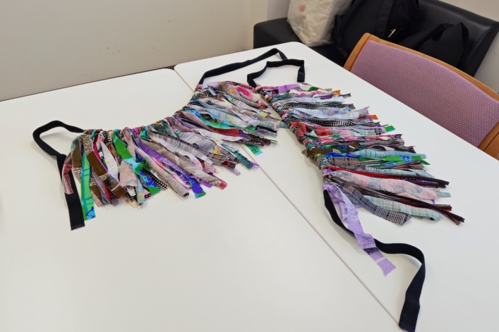 多様な素材が届き、何に使えるかメンバーで話し合いながら制作を楽しみました。看板娘の「結ちゃん人形」の髪の毛や洋服のパーツ、靴づくりに活用し、柄や素材の組み合わせを皆で工夫しました。今後も小物づくりなどに広げながら、いただいた素材を無駄なく生かしていきたいと考えています。