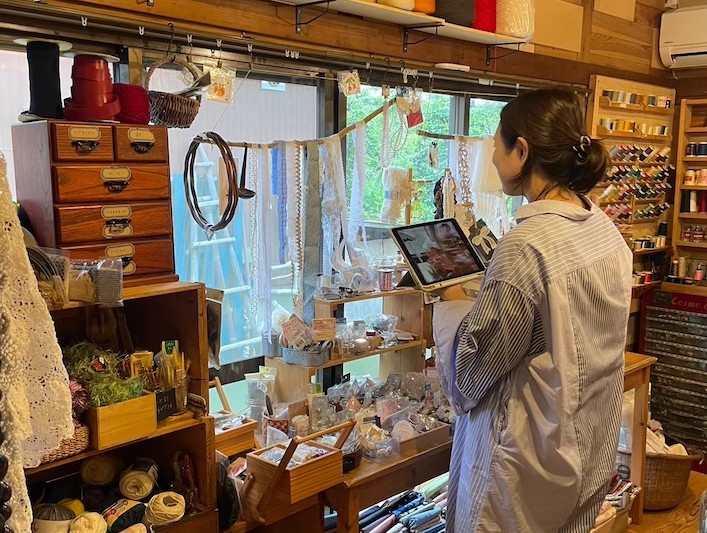 お店に並ぶのは、様々な布地を中心に、糸や針、リボンや羊毛、毛糸…..といった手芸用品、まだまだ現役で活躍できるミシンやアイロン、定規、ハサミといった道具類も。