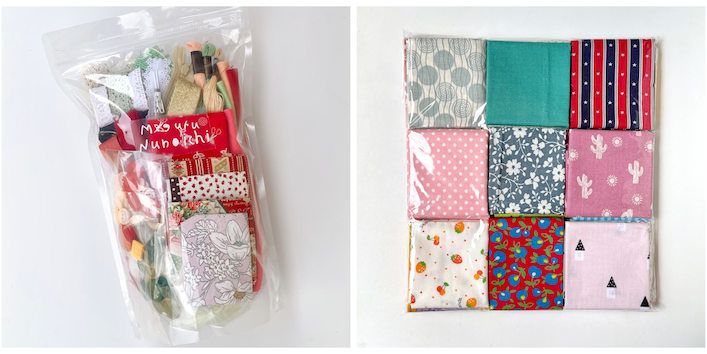 こちらはオンライン限定商品の布と手芸用品がたっぷり詰まった「つめつめセット」とミニカットクロスセット。