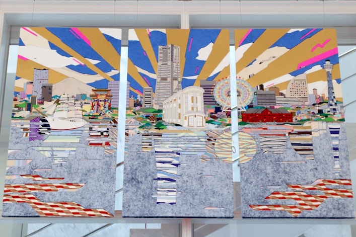 「めぐる布市」の布は、オープニングにあたって展示するアーティストの作品のために提供されました。切ったケーキのような形の建物の先端にあたる入口から入ると、ちょうど向かって奥の壁に堂々と飾られています。制作したのは、生地を埋め込む独自の手法を使う「キメコミアート」作家のイワミズアサコさん。横浜の港の風景の中にシンボル的な建物をたくさん組み合わせ、浮世絵や伝統的な織物を想起させる独特のカラフルな色使いと多様な生地の質感でおとぎ話の世界のような仕上がりになっています。