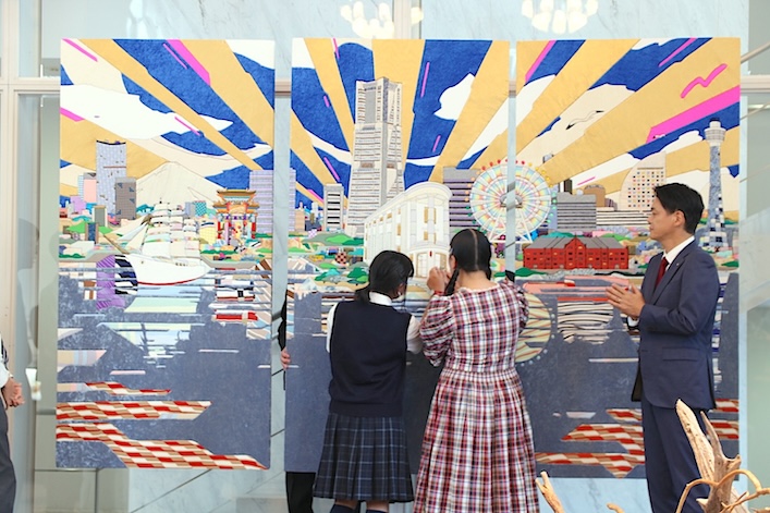 この度イワミズさんの作品への布の提供が実現したのは、BankPark YOKOHAMAを運営する株式会社竹中工務店と1階スペース「CRAFT.」を手がける株式会社CRAFTING JAPANの「横浜で活動している人と工芸やアートをつなげ、発信していきたい」という思いから。新たな施設オープンに向け横浜市内のさまざまな企業や団体と意見交換を重ねる中で、出口プロジェクトへの参加につながりました。竹中工務店開発計画本部の倉田駿さんは、「横浜にはランドマークがたくさんある中で、巧みに一枚の絵に表現していただきました。横浜とアートをここから盛り上げていくきっかけになれば」と話します。