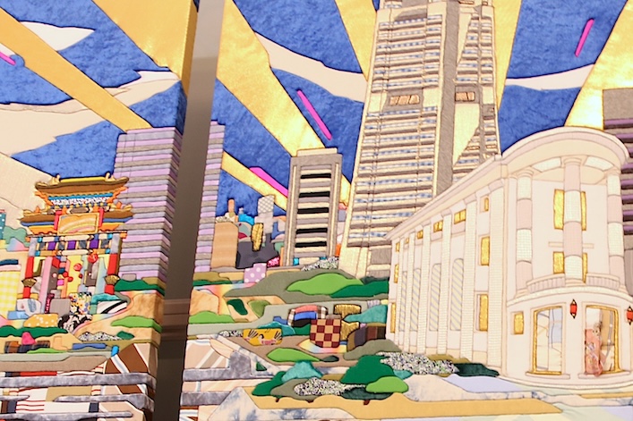 使われている布は、横浜繊維振興会からの提供分も含む約200種類にのぼります。土台となる廃材の発泡スチロールも横浜市内の企業の提供を受けて制作されました。下絵を描いて計画的に作っていくのかな? と思いきや、その場その場でかなり自由に作るそう。中華街の門が一番大変だったとのことで、よく見てみるとたしかにその細かさがわかります。