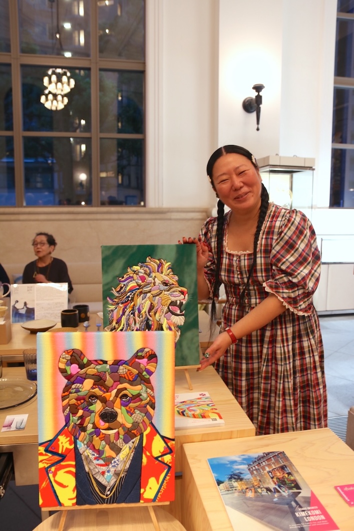 イワミズさんは、ファッションデザイナーとしてキャリアを積んだ後、2008年からアーティストとして活動を開始。薄利多売や過剰包装など、“ファッション大国日本”で感じる問題に着目しながら、スタイルとテクニックを確立させていったそうです。「キメコミアート」は人形にみられる日本の伝統技法「木目込み」から着想を得たもので、古着や服を作る過程で出るサンプル用の生地、廃材などを積極的に利用し、平面だけでなく立体的な作品も作っています。