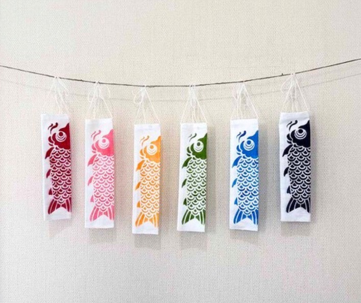 型紙とスタンプを使ったステンシル技法で好きな色に染めることができ、複数の鯉のぼりを組み合わせてオリジナルの飾りを作ることも可能です。
