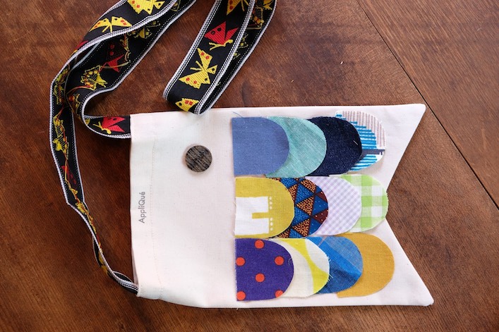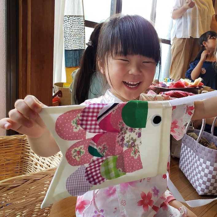 ハギレの柄をうろこの模様に見立てた「こいのぼりポシェット」のワークショップです。