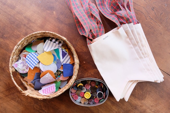 ボタンやフェルトを目のパーツとして使います。うろこにする布はボンドで貼り付けていくので、小さなお子さんでも取り組みやすいワークショップです。