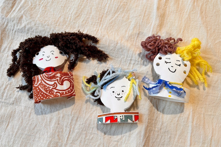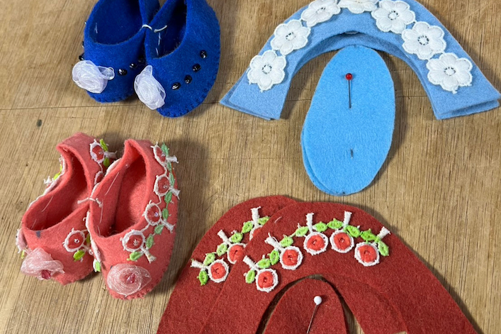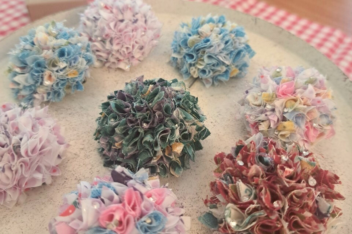 多様な素材が届き、何に使えるかメンバーで話し合いながら制作を楽しみました。看板娘の「結ちゃん人形」の髪の毛や洋服のパーツ、靴づくりに活用し、柄や素材の組み合わせを皆で工夫しました。今後も小物づくりなどに広げながら、いただいた素材を無駄なく生かしていきたいと考えています。