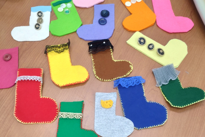 布やボタン、刺繍糸、リボン、フェルトなどを活用し、利用者とともにクリスマスリースやオーナメント、シェイカー楽器を制作しました。素材を選ぶ時間も交流の場となり、自立支援課題ではフェルトの靴下を作り洗濯物を干す練習にも活用。リユース素材を通して創作と学びの活動が広がりました。