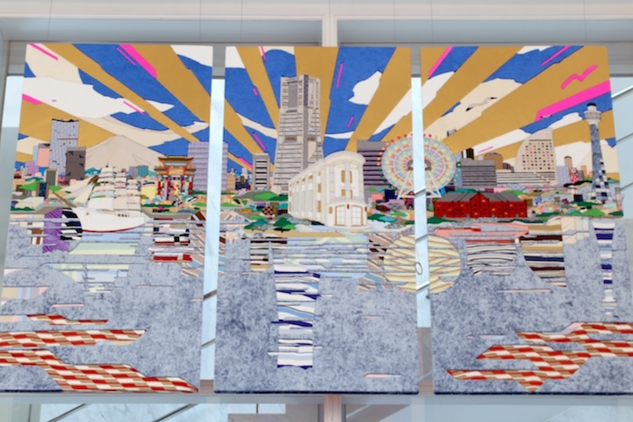 提供された布や端材は、開館記念にエントランスに飾られたキメコミアート作家のイワミズアサコさんの展示作品の制作素材として活用されました。色とりどりの布をコラージュのように組み合わせ、都市の風景や空間を表現する大型作品に展開。リユース素材ならではの質感や色彩が作品の魅力を高め、来場者の印象に残る空間づくりに生かされました。