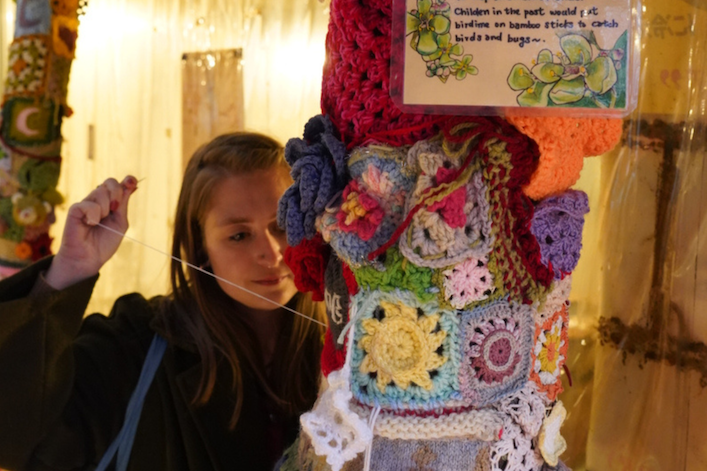 毛糸を使ったストリートアート「ヤーンボミング」に活用。参加者が編んだ小さなパーツをコラージュし、原宿のデザインフェスタギャラリー内の木々を装飾しました。毛糸だけでなくチャックやベルトなどの副資材も作品に取り入れ、初心者には編み針などの道具も配布。多様な素材が創作と交流のきっかけになりました。