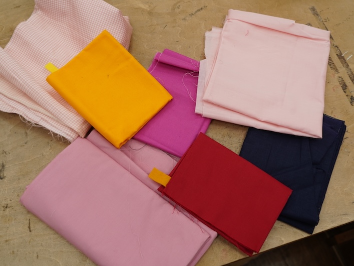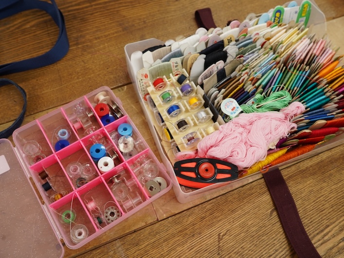 もともと山田さんはめぐる布市をご存知で、お買い物もしたことがあったのだそう。制作活動の資材に活用したいと出口プロジェクトに応募し、刺繍に使いやすいシンプルな無地の布、柄のハギレ、糸、ボビン、バイヤステープ、毛糸、編み針など、多様な品々を資材として受け取りました。