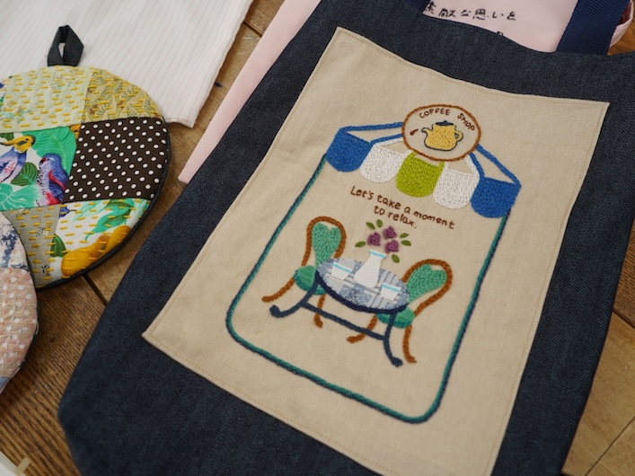 今回、手仕事の温かみと作り手の感性を生かした刺繍作品をたくさん見せていただきました。地域のバザーや地域ケアプラザでの販売会、横浜市民ギャラリーあざみ野でのフェローマルシェなどに出店しているので、そうした場で作品を手にとっていただくことができます。また、手作りサイトのminneでも、商品を販売しているそうです。大倉山の喫茶ぽるくでは、「my favorite cafe」をテーマに作品展を開催し、おしゃれでユーモラスな刺繍をほどこした作品を展示しました。