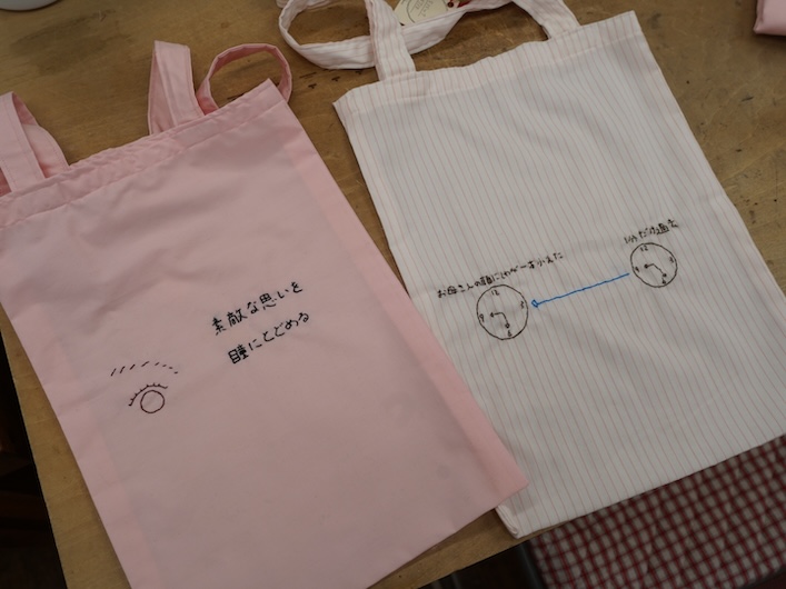 こちらは、利用者さんがノートに書き留めた詩やイラストをバッグに刺繍した作品です。出口プロジェクトの生地で制作したエコバッグに、ひと針ひと針、詩とイラストを刺繍で表現しています。「普段は選ばないかわいい色の布を使えてうれしかったです」と話してくださいました。