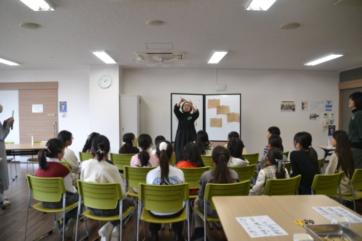 会場では8名のスタッフが念入りに準備し、参加者を迎えます。この日の参加者約20人は小学生の女の子ばかりでしたが、普段は男の子もいます。まずは全員が集まり、スタッフがヒンメリのことや作り方を説明。みんな驚くほど静かに一生懸命聞いていました。