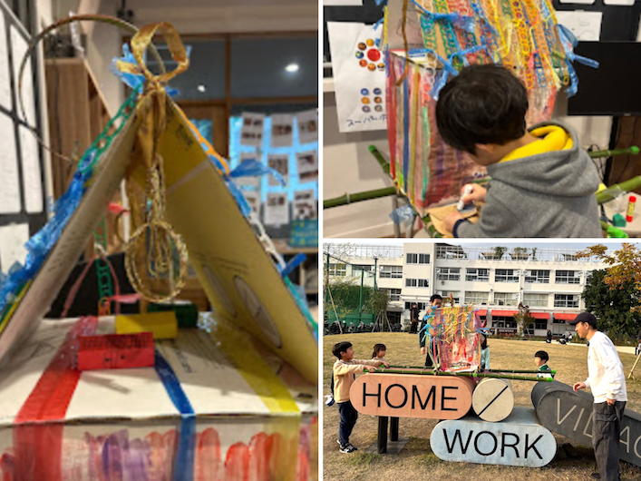 あるものは、「まち」のクラスで行われていた「神輿」(みこし)にも展開していったようです。「試行錯誤しながら、手探りで素材をかき集めて形にすることを楽しむ様子がありました」と大西さん。出口プロジェクトの素材たちが、よい教材に生かされた様子が伝わってきます。