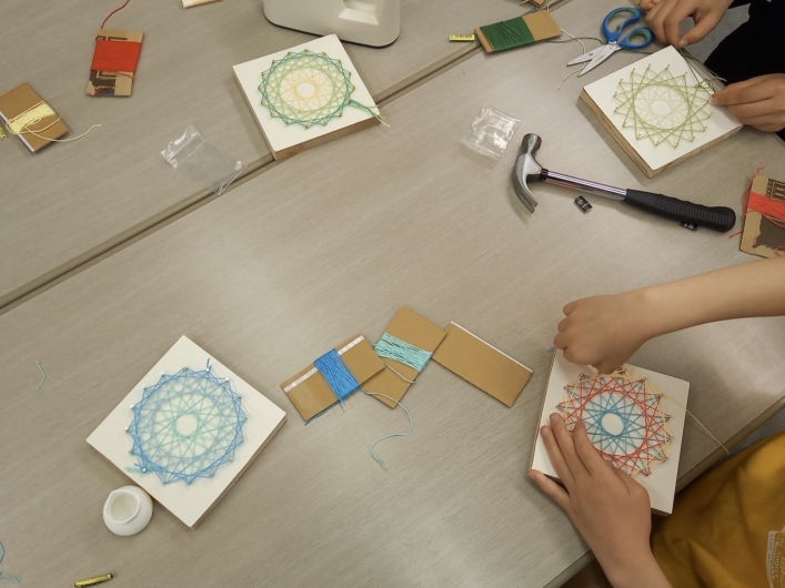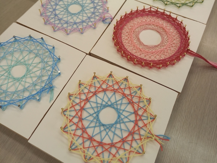 この「糸かけ曼荼羅」は、ただ見た目が綺麗なだけではなく、子どもたちに釘を打つ練習をしてもらえることに加え、糸を「素数」でかけていくということがポイントだそうです。
