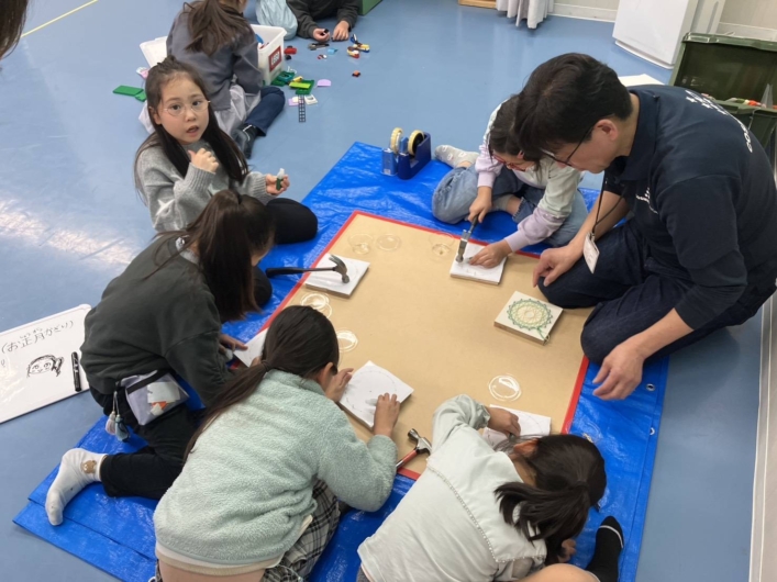 昨年夏頃から試行錯誤しつつ進めていた「糸かけ曼荼羅」は、少人数でのトライアル実施を経て、昨年12月にはコズミックジュニア(民間学童保育)で約80名の児童を対象にお正月飾り製作としてイベントを開催しました。