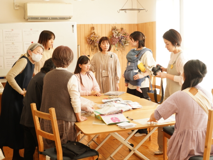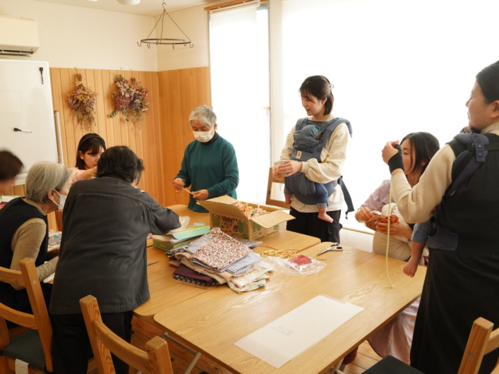 巾着づくりは、「巾着ちくちくの日」と「巾着キットづくりの日」と分けて、ワークショップ形式で毎月数回にわたって場を開き、多世代の方が初めてでも参加しやすいような工夫がなされています。
