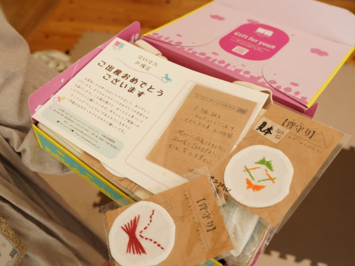 戸塚区内の赤ちゃんが生まれた家庭からお申し込みを受けて、無料で出産祝いを届けています。理念に共感した企業・団体・お店からのプレゼントのほか、まちの人からの手作りのプレゼントもあり、「まちのみんなからの出産祝い」として喜ばれています。戸塚区内の0歳児の約4割にお届けしており、2025年度は約650件にのぼるそうです。