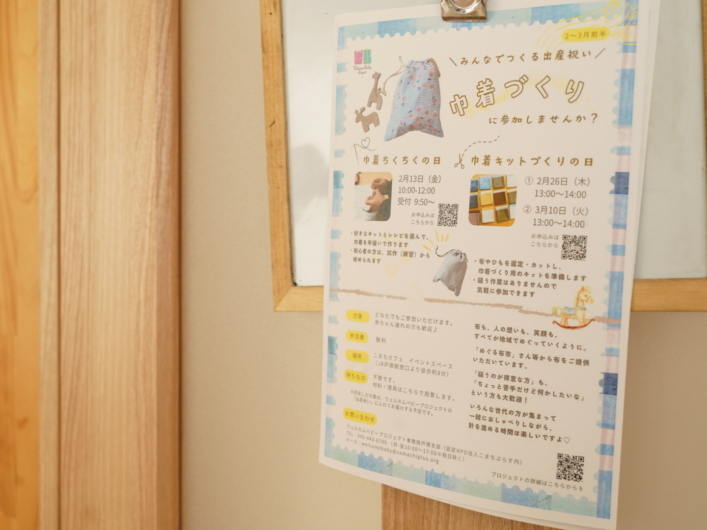 活動がおこなわれている「こまちカフェ」には、赤ちゃん連れのお客さんも多く、今回のキットづくりには、赤ちゃん連れの方が何組も参加されているのが印象的でした。9カ月の赤ちゃんのママは「だれかの役に立ちたいなと思って参加しました。キットづくりで、だれかとなんとなく話せるのは気晴らしになります」と話してくれました。
