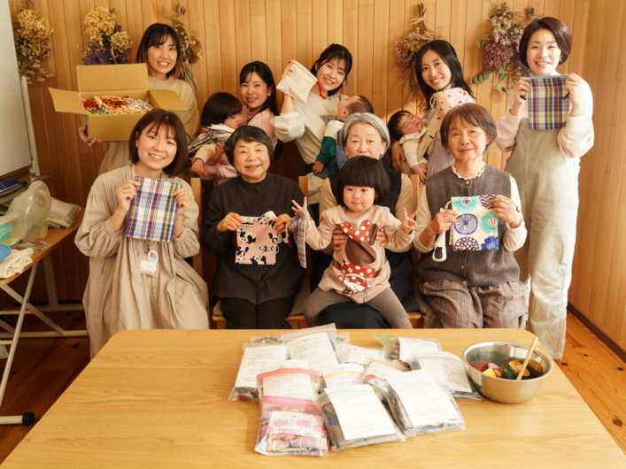 「布も、人の想いも、笑顔も、すべてが地域でめぐっていくように。」との願いを込めて、めぐる布市の出口プロジェクトで資材の提供を受け、巾着づくりに活用しています。