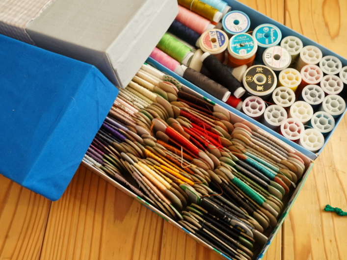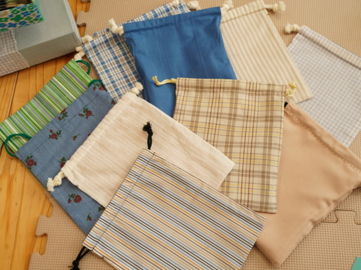 出口プロジェクトから提供したおもな資材は、布地や糸、紐など、巾着づくりに活用できる品々でした。新たに巾着をプレゼントに加える上で、試作の段階から出口プロジェクトの資材が役立ったそうです。